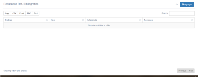 Esta sección muestra una tabla con las referencias bibliográficas registradas y permite gestionarlas.